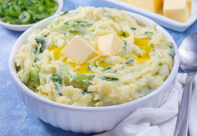 The dish dates back centuries, when potatoes and leafy greens were everyday staples in rural Irish kitchens. Butter and cream transform these simple ingredients into something rich and comforting. In Ireland, a small well of melted butter is often pooled in the center of the mashed potatoes so each bite can be dipped into it.